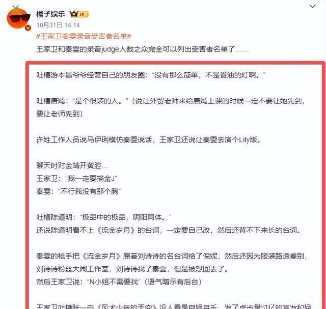 对此,还有博主给王家卫秦雯录音事件列出了一个“受害者名单”,就连游本昌、唐嫣、陈道明、靳东等人都在其中。